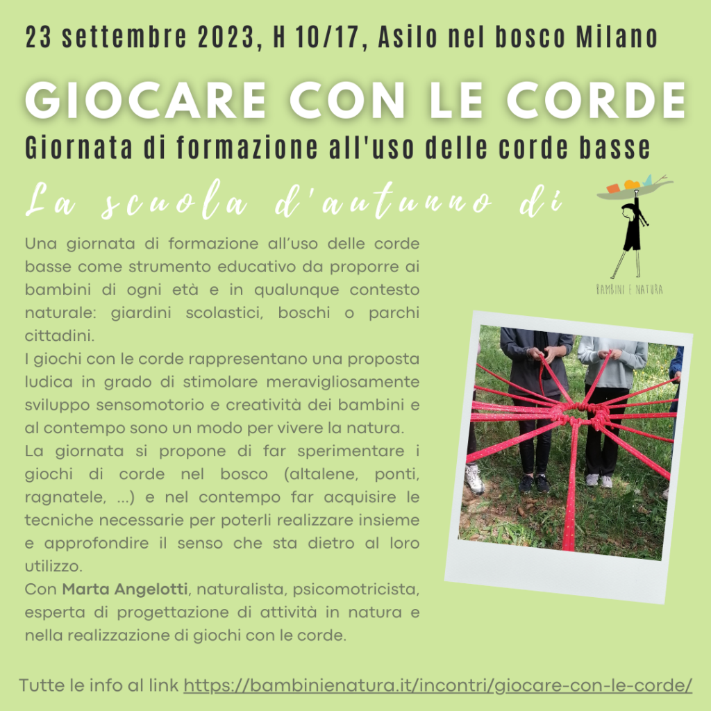 Una giornata di formazione all’uso delle corde basse come strumento educativo da proporre ai bambini di ogni età e in qualunque contesto naturale: giardini scolastici, boschi o parchi cittadini.